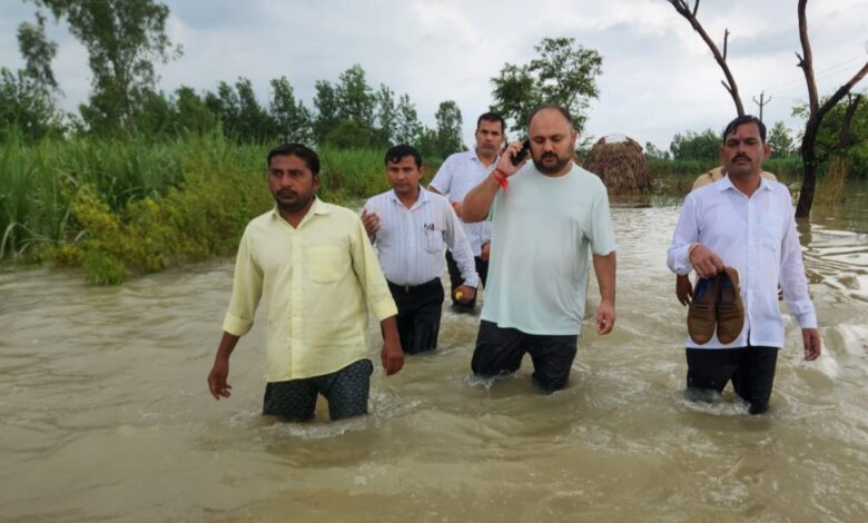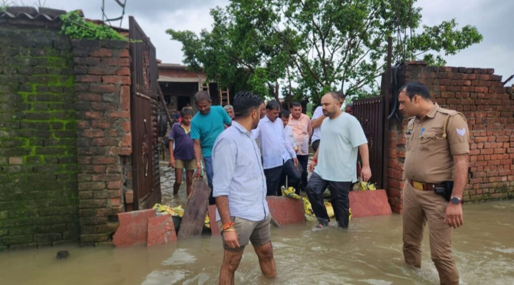 बाढ़ के पानी में पैदल घुसे डीएम और तहसीलदार